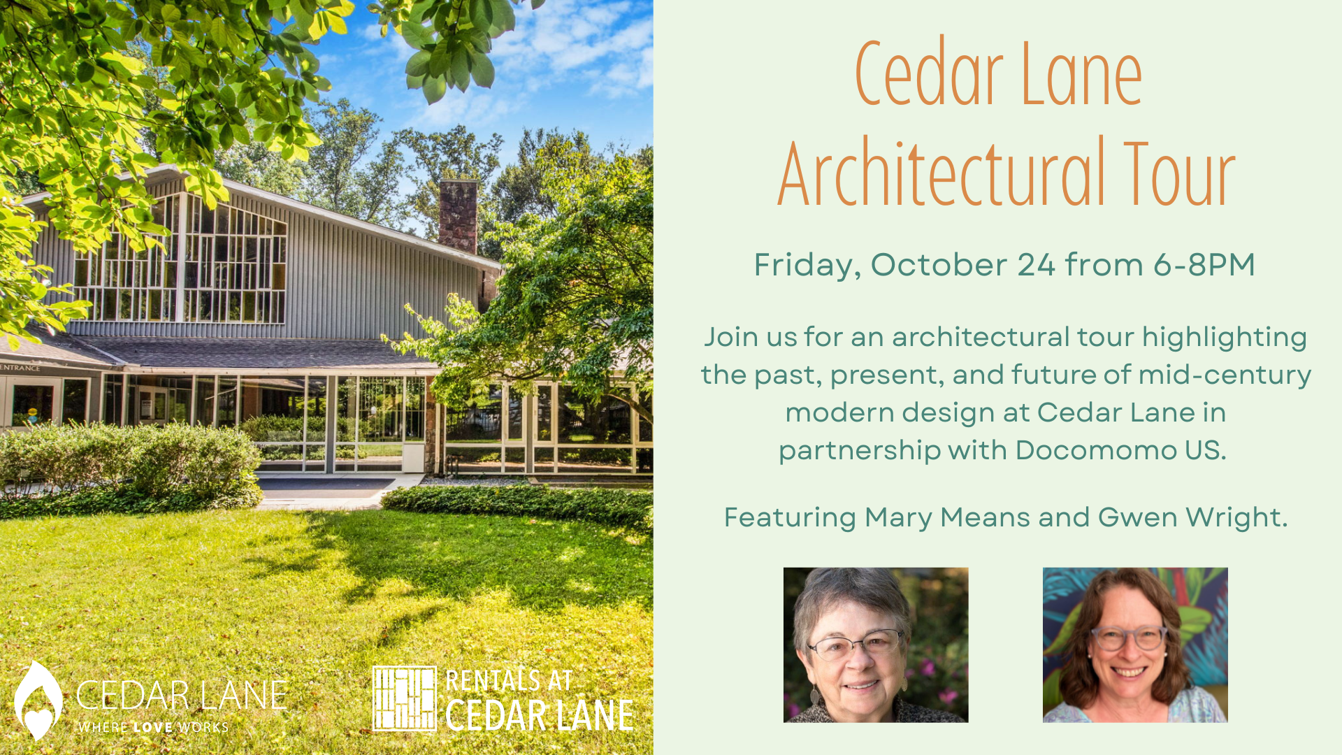In partnership with Docomomo, Cedar Lane is hosting an architectural tour for this year's "Places of Worship" theme. Join us for a two-hour guided tour led by member and renovation task force co-chair Mary Means, alongside local planner and preservationist Gwen Wright.